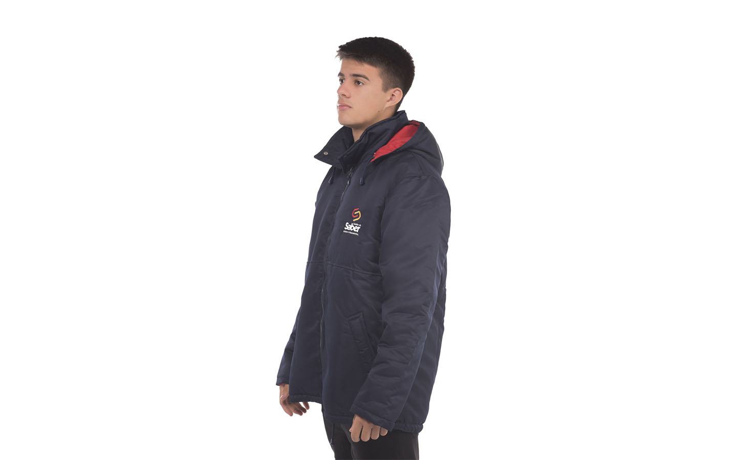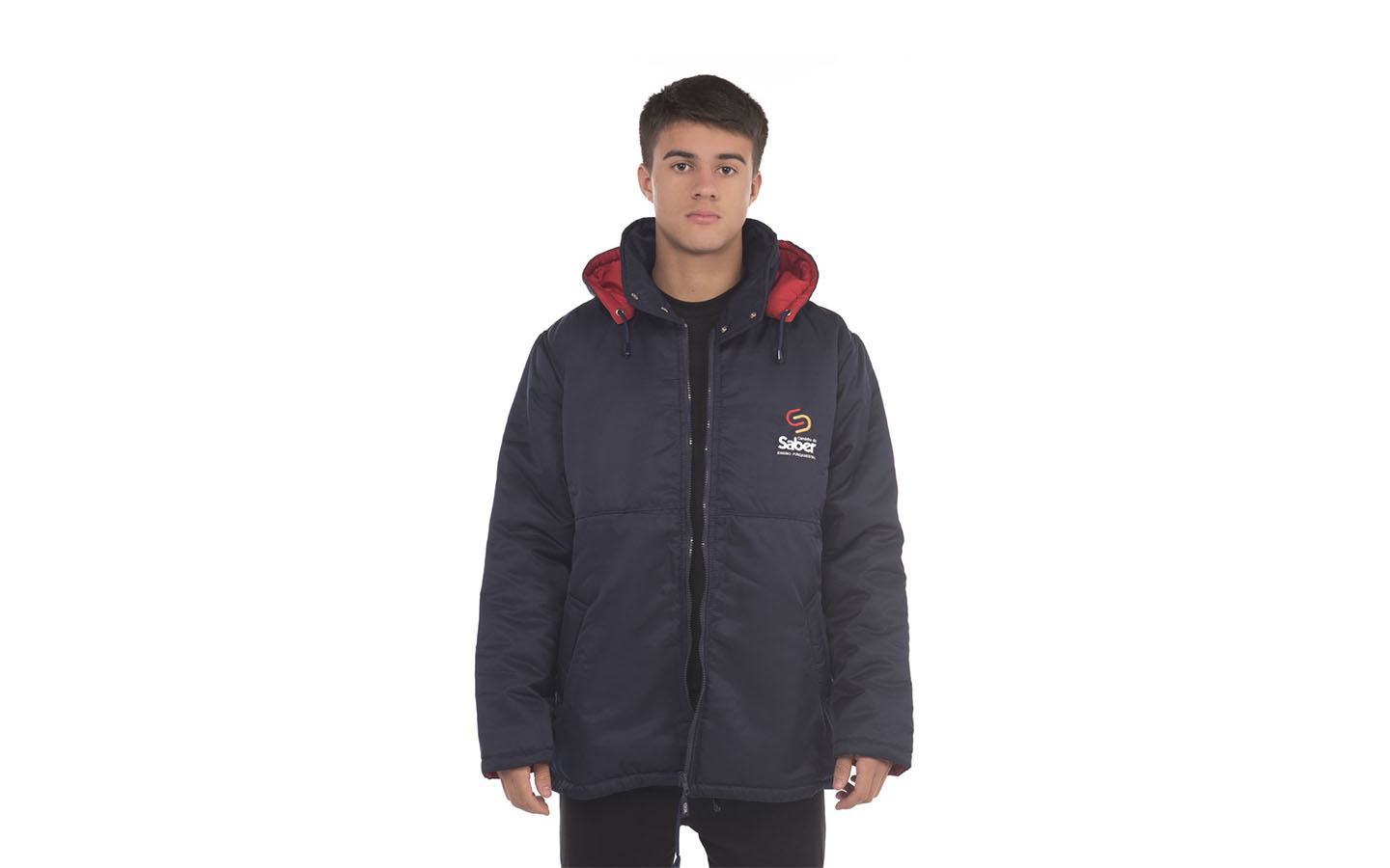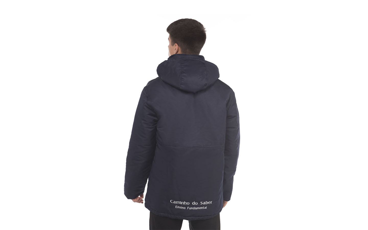 Jaqueta confecionada em tecido Nylon Plus, acolchoada com manta térmica (Fibra) e com capuz destacável.