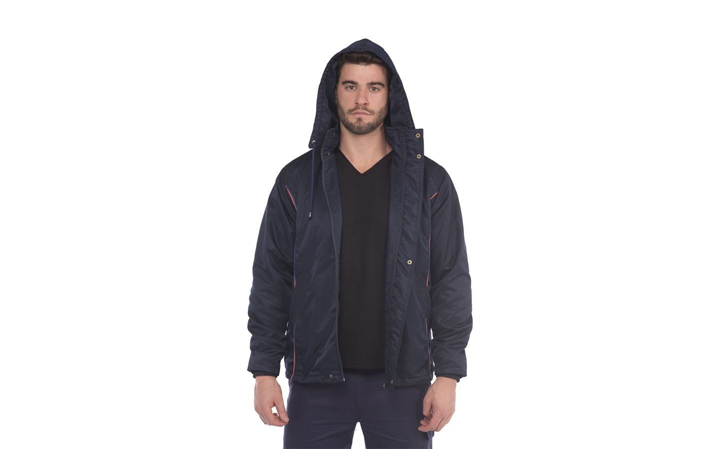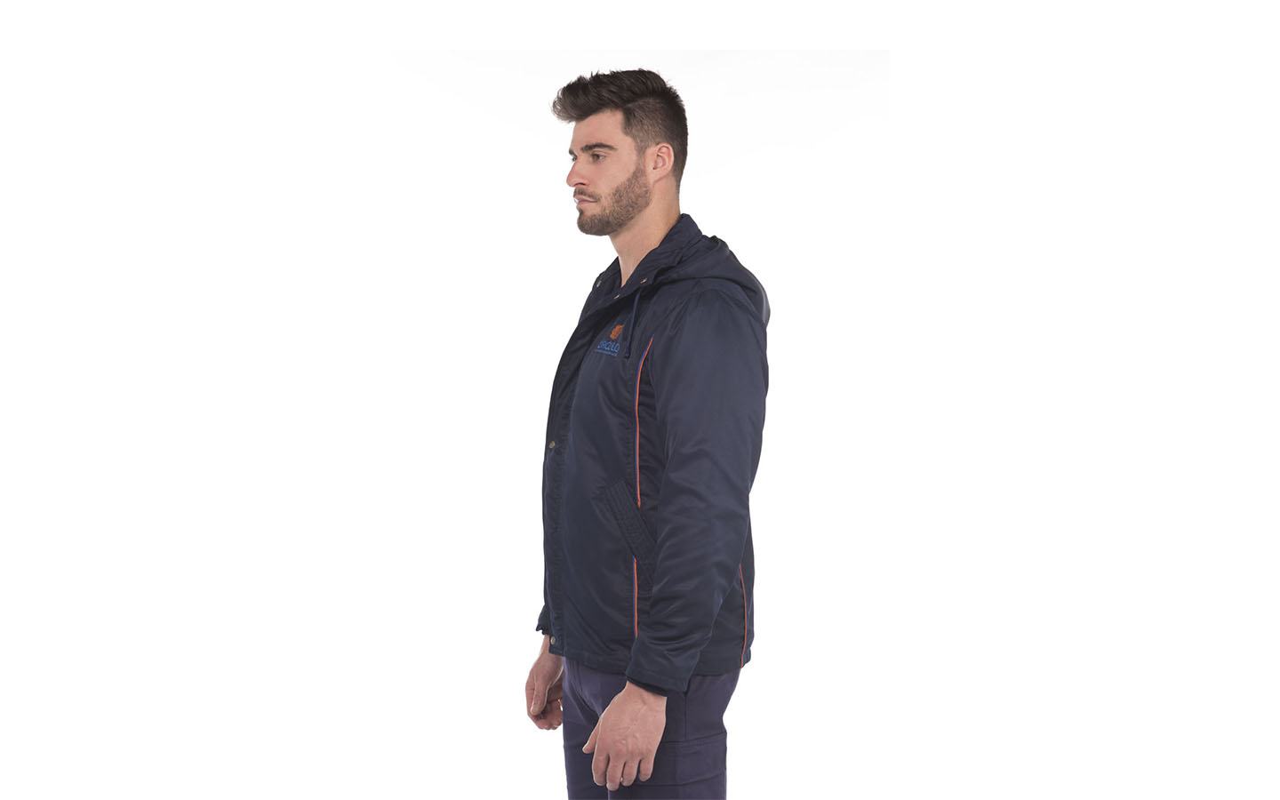Jaqueta confeccionada com tecido Nylon Plus, com forro Soft e que também pode ser utilizada como capa de chuva.
