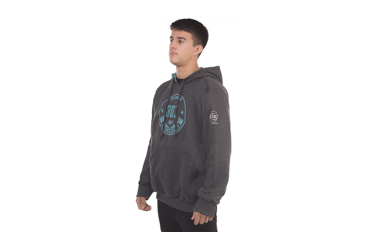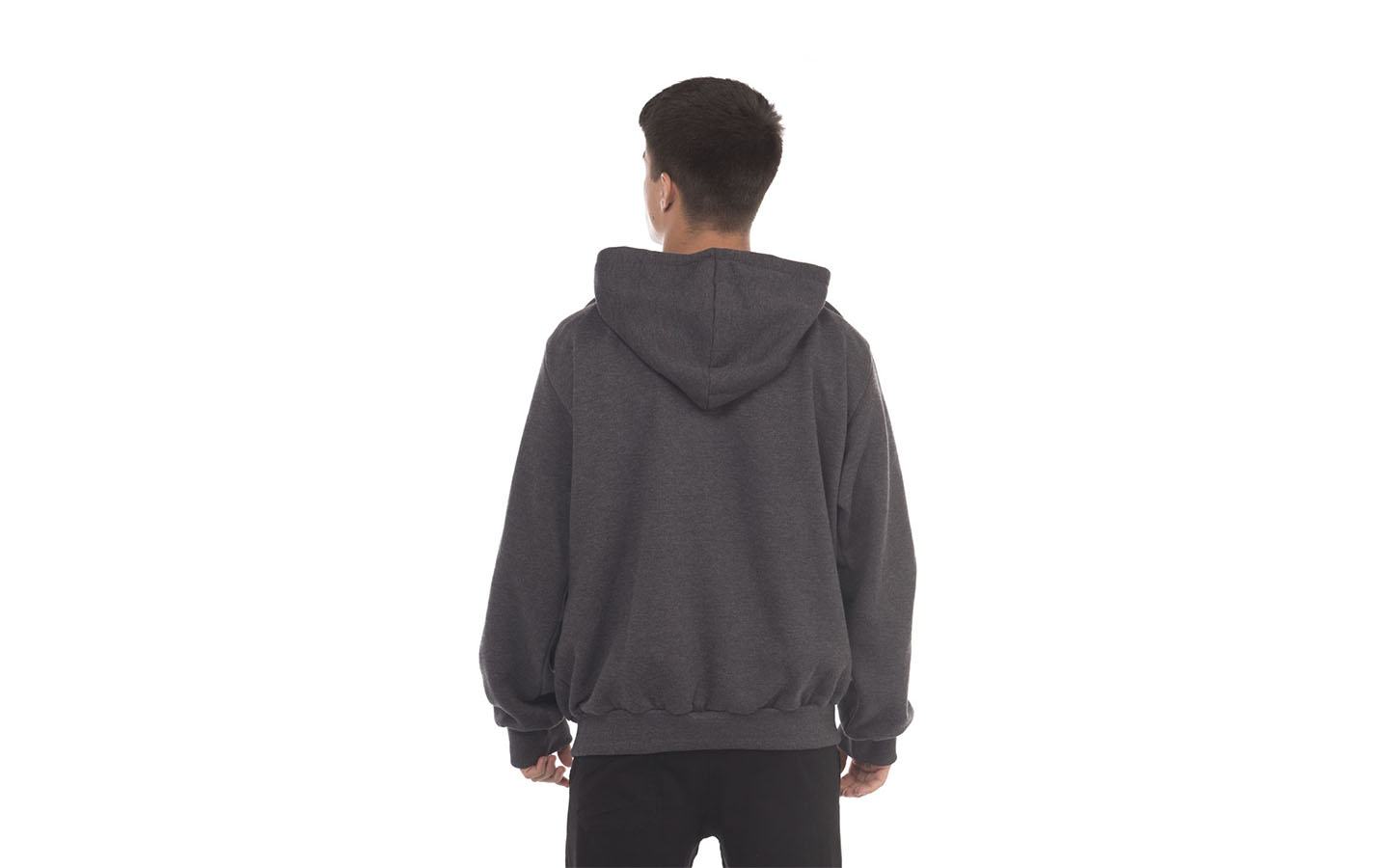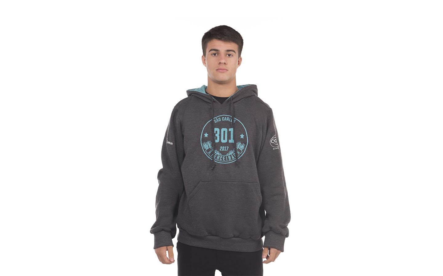 Moletom Canguru, com bolso frontal e capuz. Tecido composto por 50% de algodão e 50% de poliéster, sendo peluciado na parte interna.
